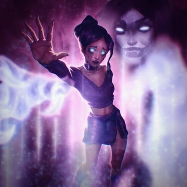 Fear has a way of summoning the unexpected. In this dark, atmospheric piece, a frightened character inadvertently calls forth a ghostly, malevolent figure—both protector and threat—its hands reaching out toward the viewer. The tension between vulnerability and sinister power drives the narrative, with shadows and subtle lighting amplifying the haunting atmosphere.